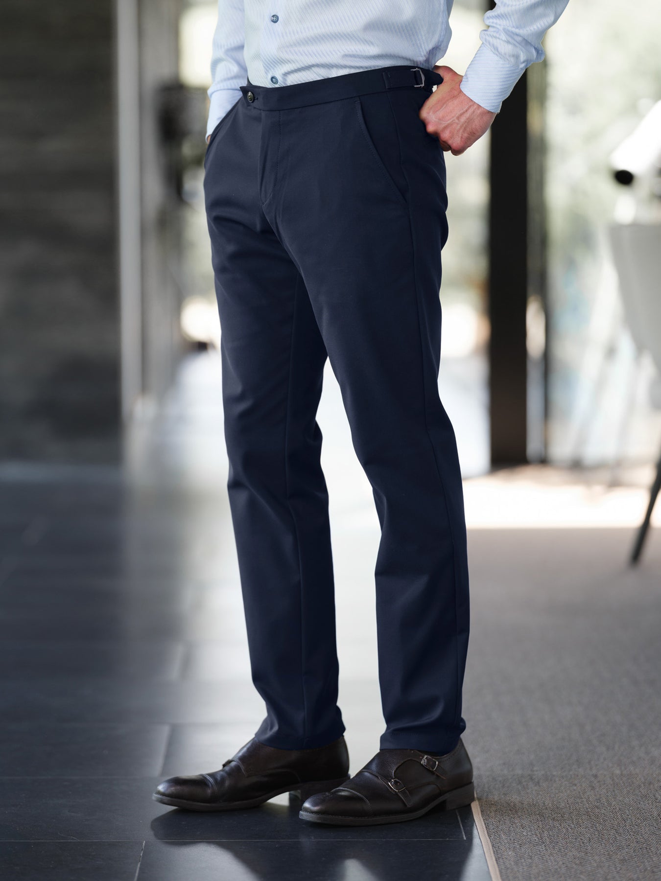 Zack Trouser er en behagelig bukse i klassisk navy farge. Den har normal livhøyde med skrålommer i front og passpolerte baklommer. Denne buksemodellen har noe løsere passform enn vår klassiske modell Tom Trouser.