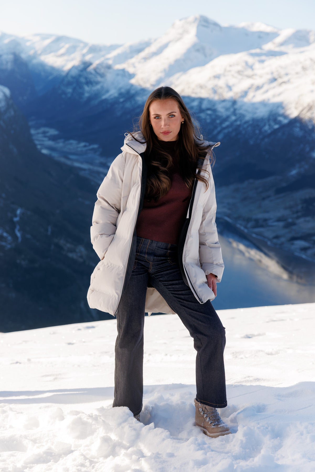 Favoritten fra i fjor er tilbake i en nydelig cream farge denne høsten! Den har medium lengde med glidelås og knyting i midjen som gir jakken en flott fasong. Lommer i sidene med glidelås. Høy hals og romslig hette. Den perfekte jakken som holder deg varm gjennom høsten- og vinteren! Vanntett kvalitet.