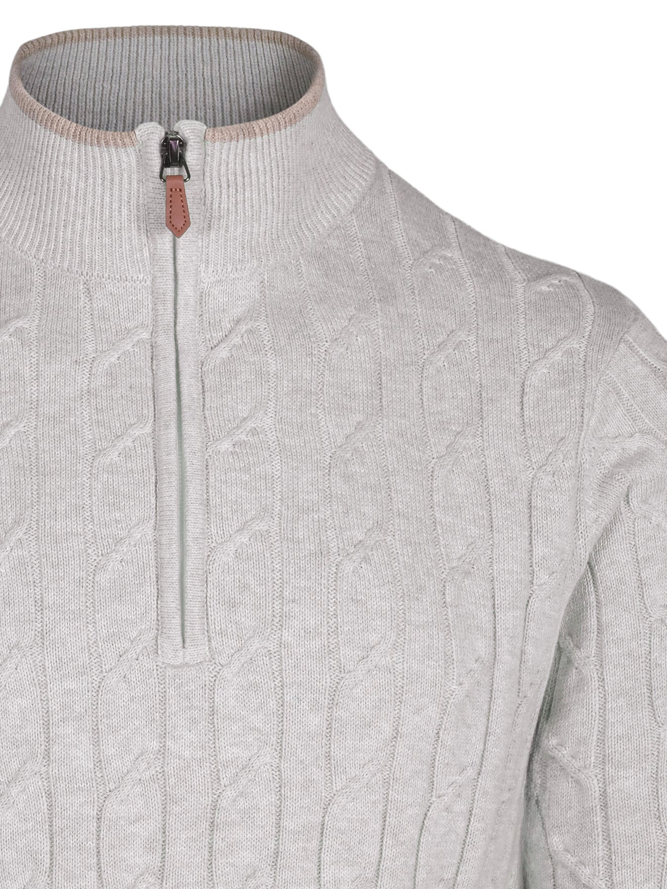 Favoritt Sivert Zip er tilbake! Utrolig delikat strikket mønster i stoffet. Genseren har halv-høy hals med glidelås. Tidløs og elegant genser som passer fint alene eller over sesongens skjorter. Kombineres gjerne med våre Tom-bukser. Laget i en behagelig bomull/cashmere kvalitet.