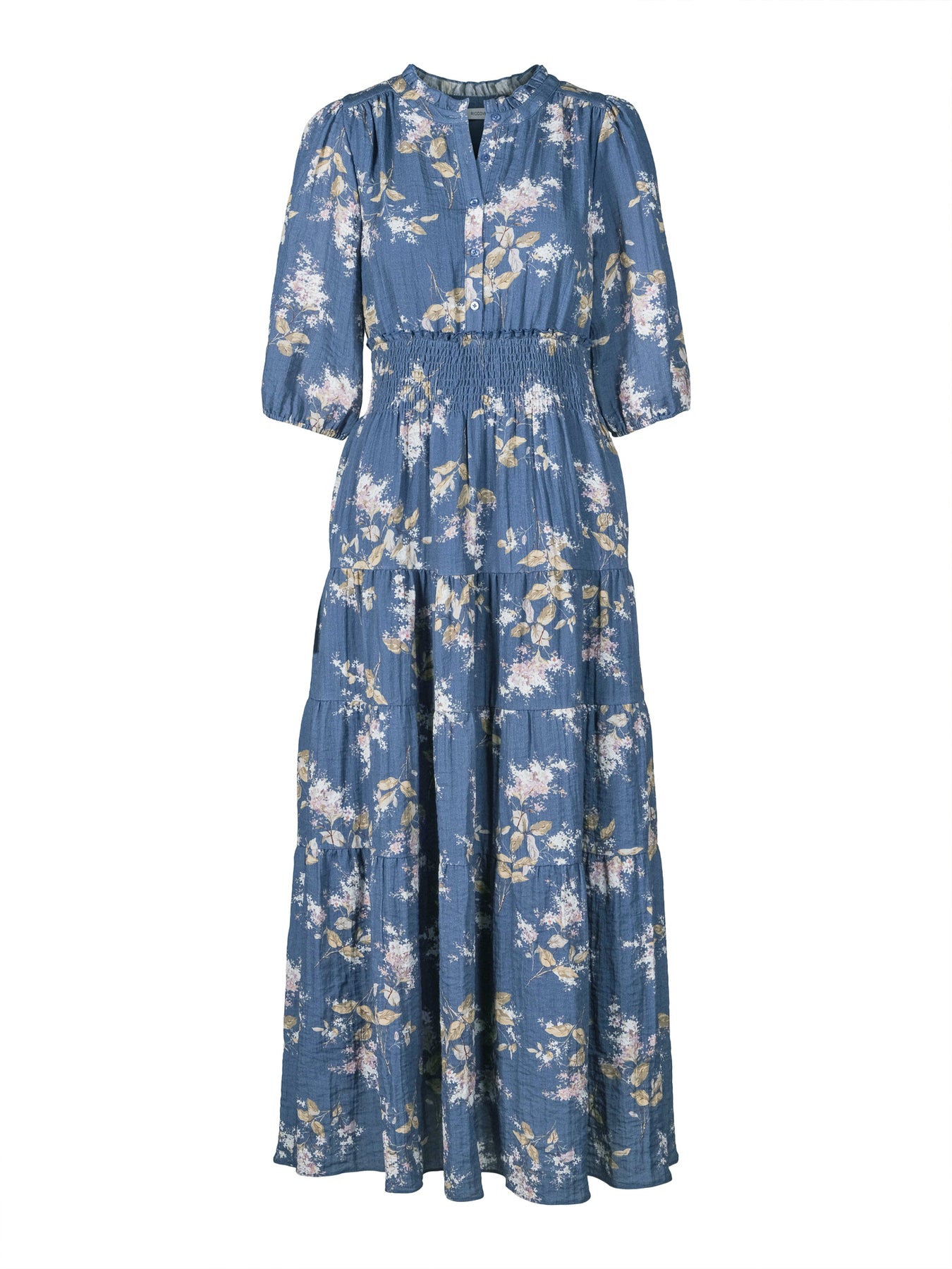 Prarie Dress er den perfekte, lange kjolen til sesongens anledninger. Delikat blomsterprint i nydelig blå farge. Den har v-neck med knepping øverst og detaljer på kragen. Strikk i midjen som gir en flott fasong samtidig som den føles behagelig på. Tre kvarts ermer og praktiske lommer i sidene. Utrolig lett og behagelig kvalitet holder seg fint.