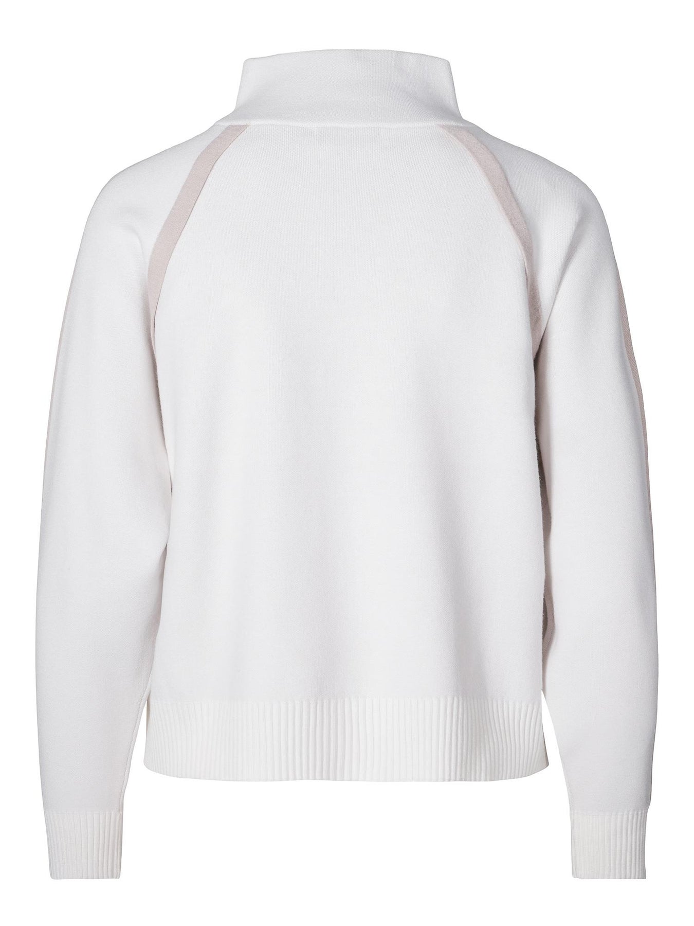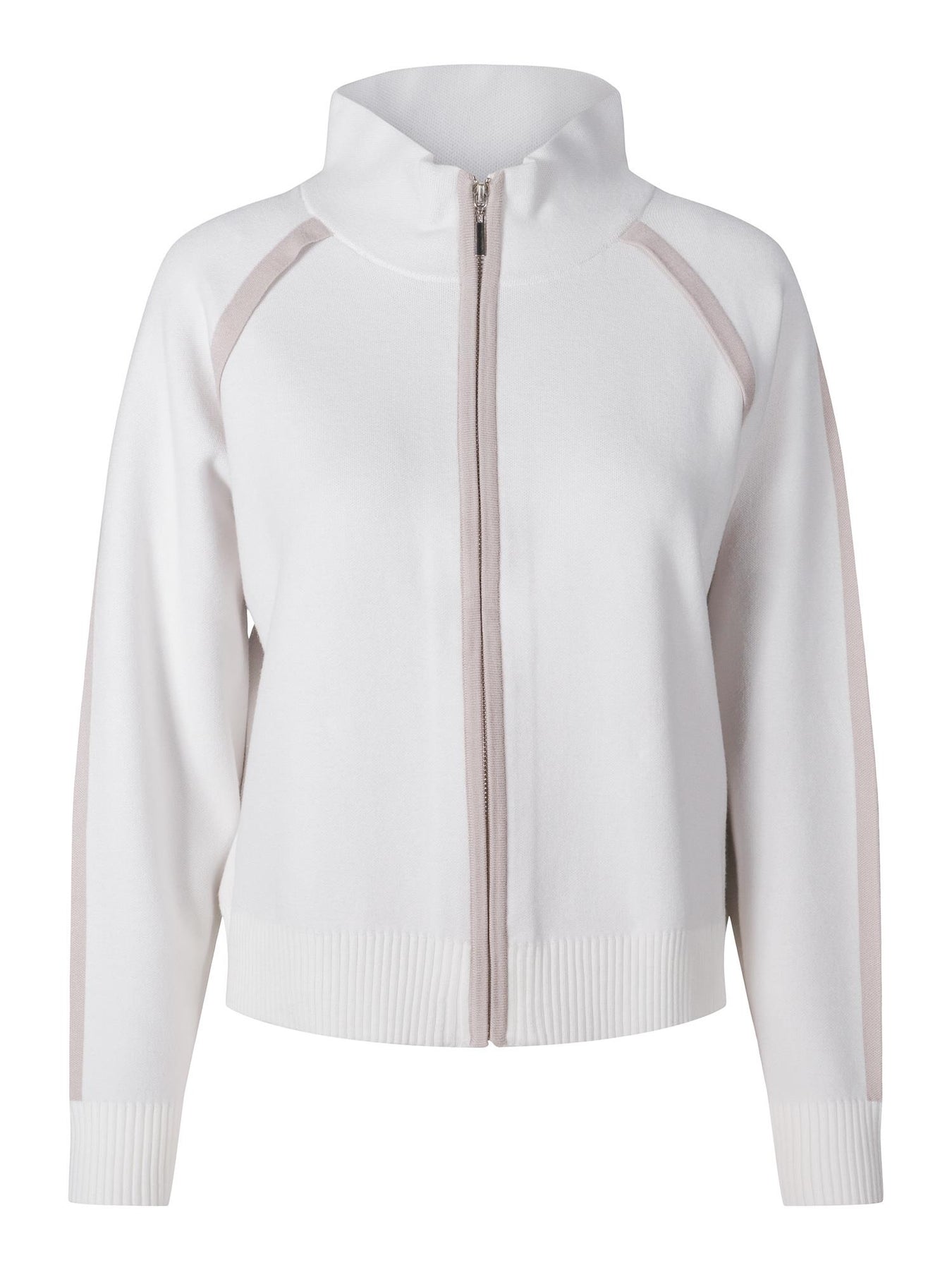 Lett, klassisk og komfortabel cardigan med glidelås i front. Den har høy krage og ribbestrikket kanter som gir en fin passform. Tidløs cream farge med delikate kontrastfelt i beige som gjør den klassisk og enkel og style til dine antrekk. Myk og behagelig viscose blanding.