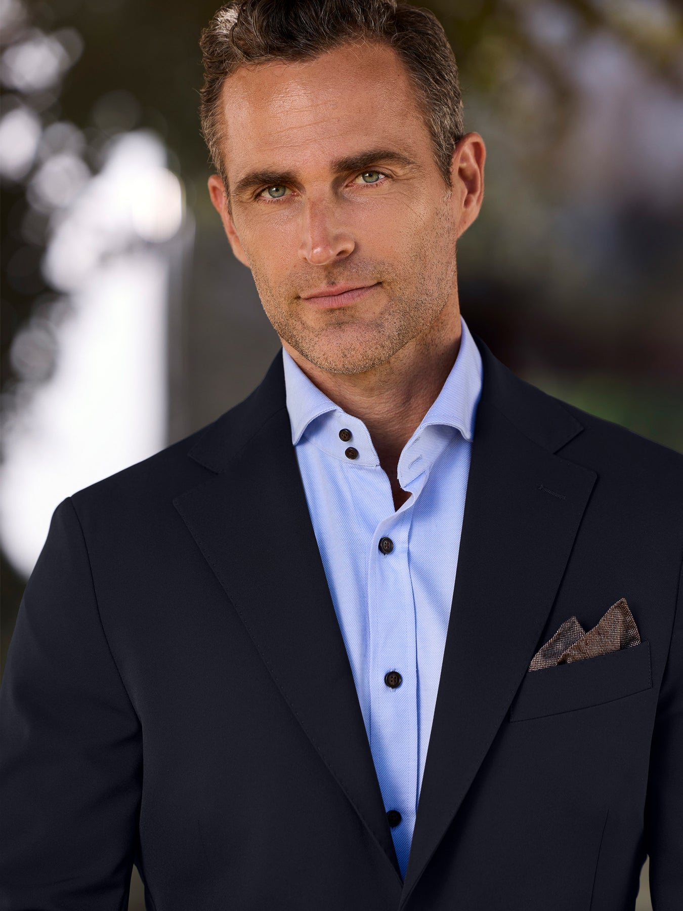 Havanna Blazer i en helt fantastisk kvalitet med god og behagelig stretch. Moderne blazer med 2 splitter bak og utenpåsatte lommer uten klaff. Klassisk navy farge som passer enhver anledning.