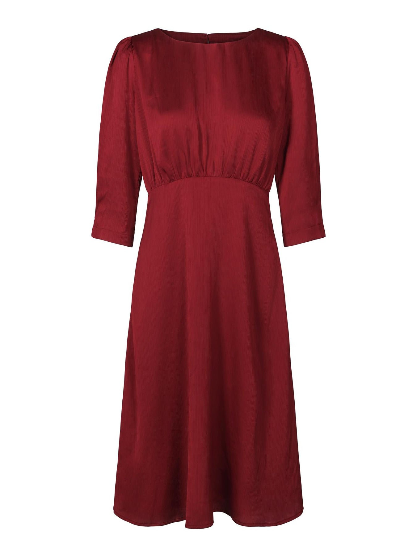 Cinco Dress er en klassisk og elegant kjole med lettere innsvinget passform. Den har round-neck og tre kvarts ermer. Medium lengde og splitt i siden. Laget i en behagelig kvalitet med delikat struktur i stoffet. Vakker rød farge til sesongens festligheter!