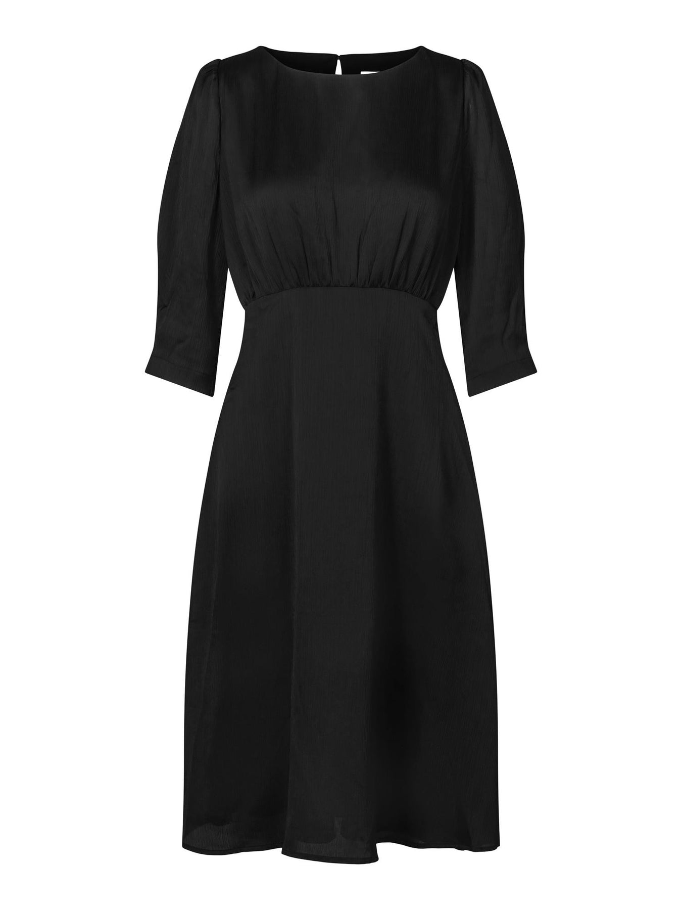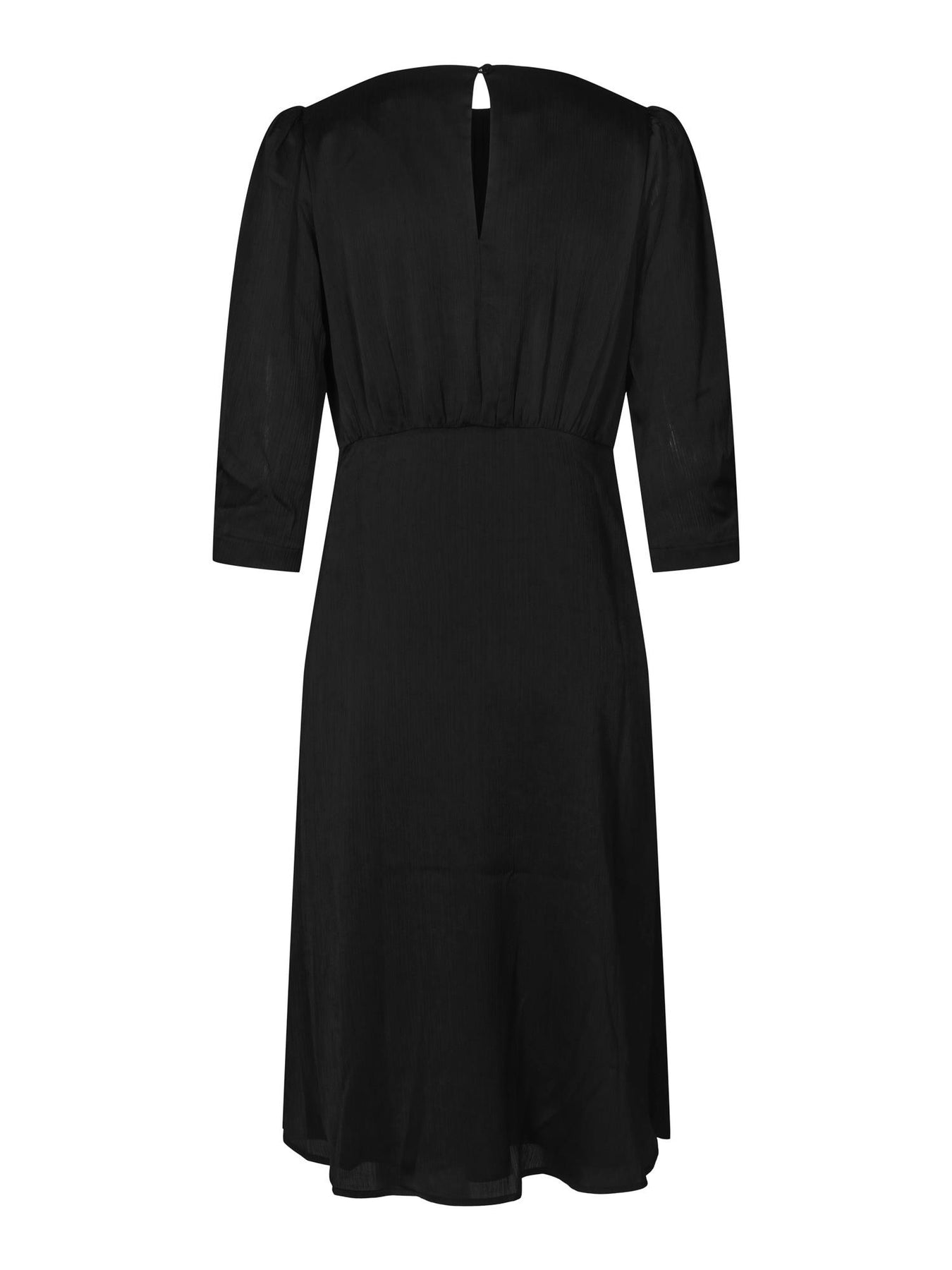 Cinco Dress er en klassisk og elegant kjole med lettere innsvinget passform. Den har round-neck og tre kvarts ermer. Medium lengde og splitt i siden. Laget i en behagelig kvalitet med delikat struktur i stoffet. Tidløs sort farge til sesongens festligheter!