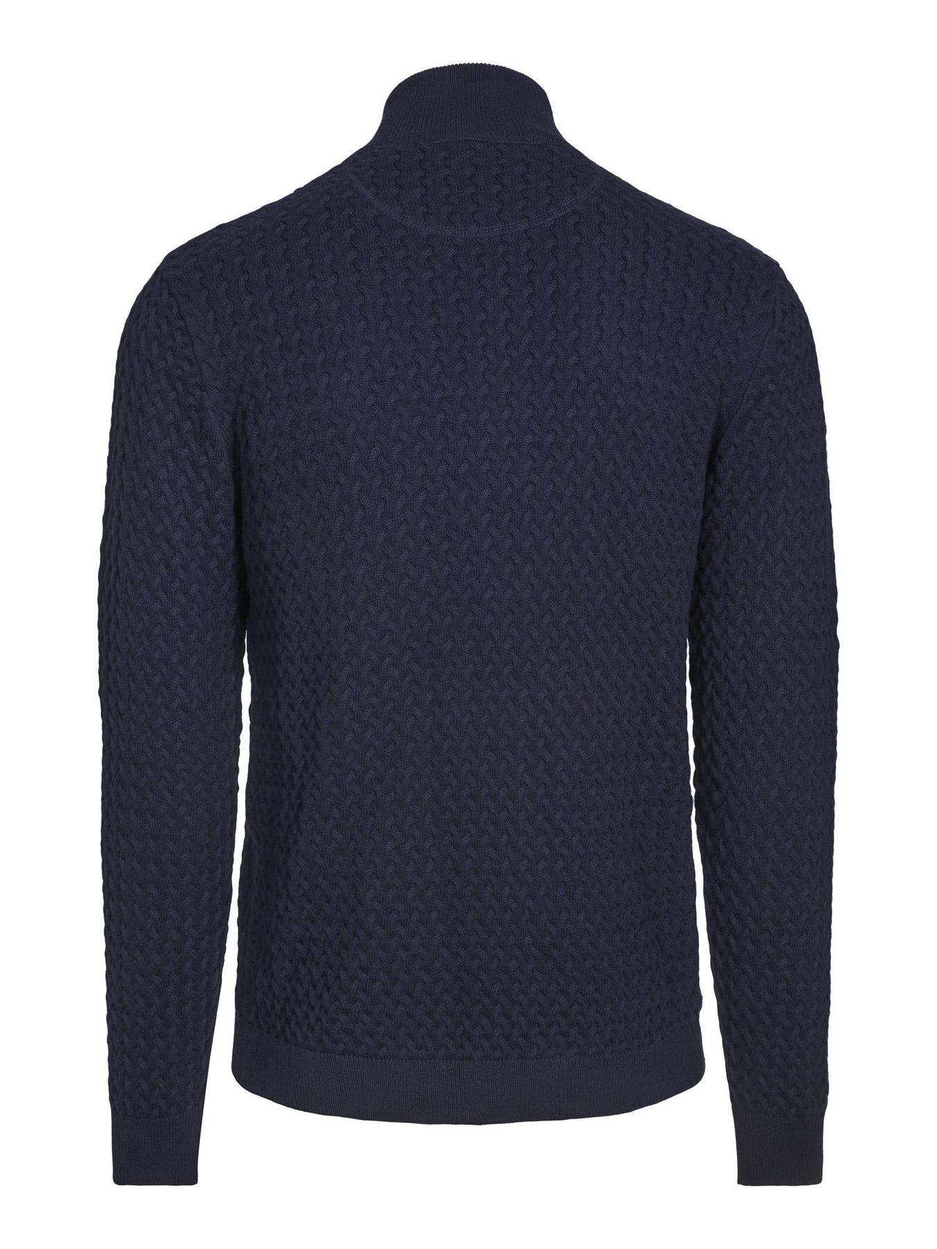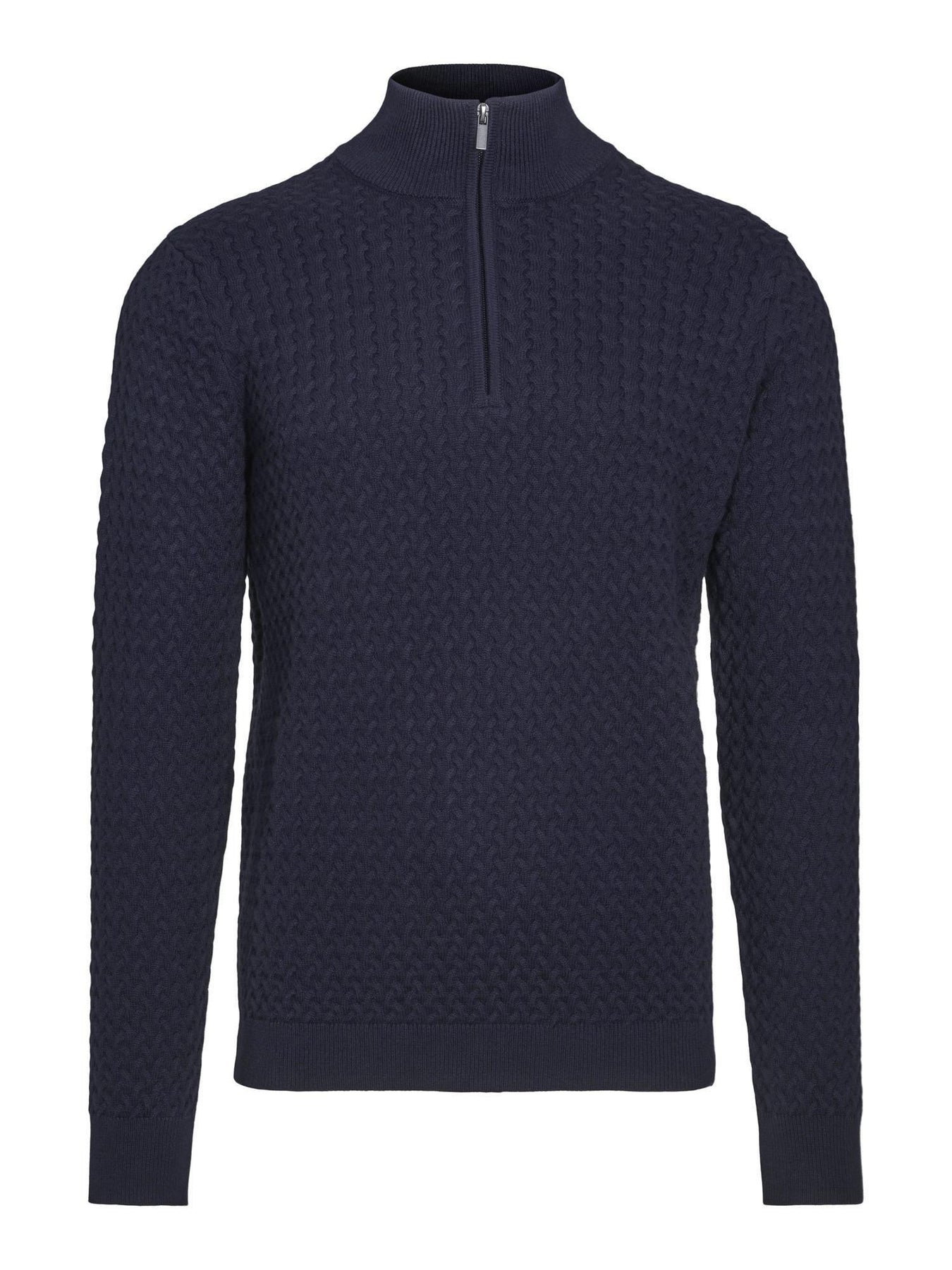 Bestselger Joe Zip er en utrolig flott strikk i en behagelig bomull/cashmere blanding. Elegant og tidløs genser med delikat flettemønster i stoffet. Half-zip. Passer også fint over skjorten. Kombineres gjerne med våre Tom bukser. Varm og deilig til sesongens kjølige dager. Klassisk navy farge.